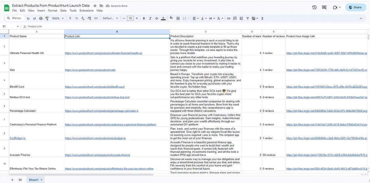 Spreadsheet Writing: Transforms extracted data into a neatly organized spreadsheet, making analysis and decision-making more straightforward.Comprehensive Coverage: Works across all sectors and industries, making it a versatile tool for market research and company insights.