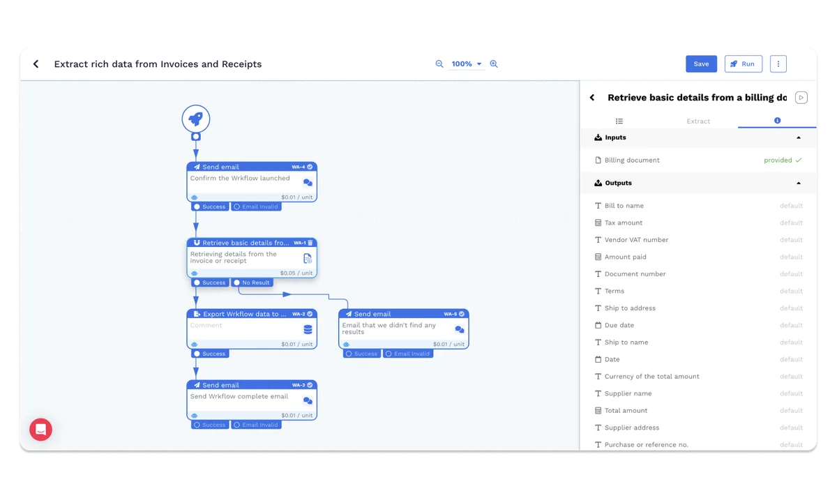 Streamline your financial data processing. Use Wrk's automation to extract useful details like vendor information, payment terms, and delivery details from invoices and receipts, converting paperwork into comprehensive financial data for smart business management.