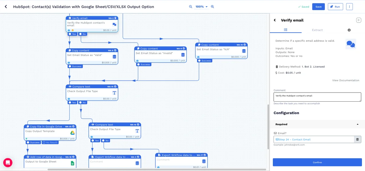 Enhance your HubSpot experience with our automated workflow. Easily download your list of HubSpot contacts and have their email addresses validated and verified. Improve your communication efforts and maintain a clean and accurate contact list, all conveniently exported into a CSV, XLSX, or Google Sheets format.