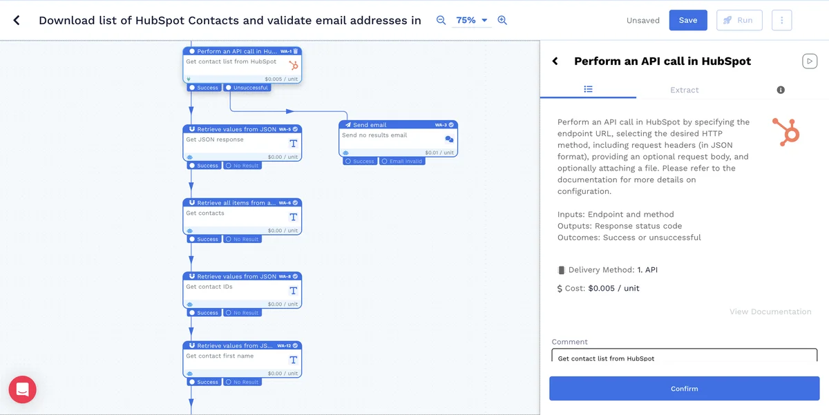 Enhance your HubSpot experience with our automated workflow. Easily download your list of up to 100 HubSpot contacts and have their email addresses validated and verified. Improve your communication efforts and maintain a clean and accurate contact list, all conveniently exported into a CSV format.